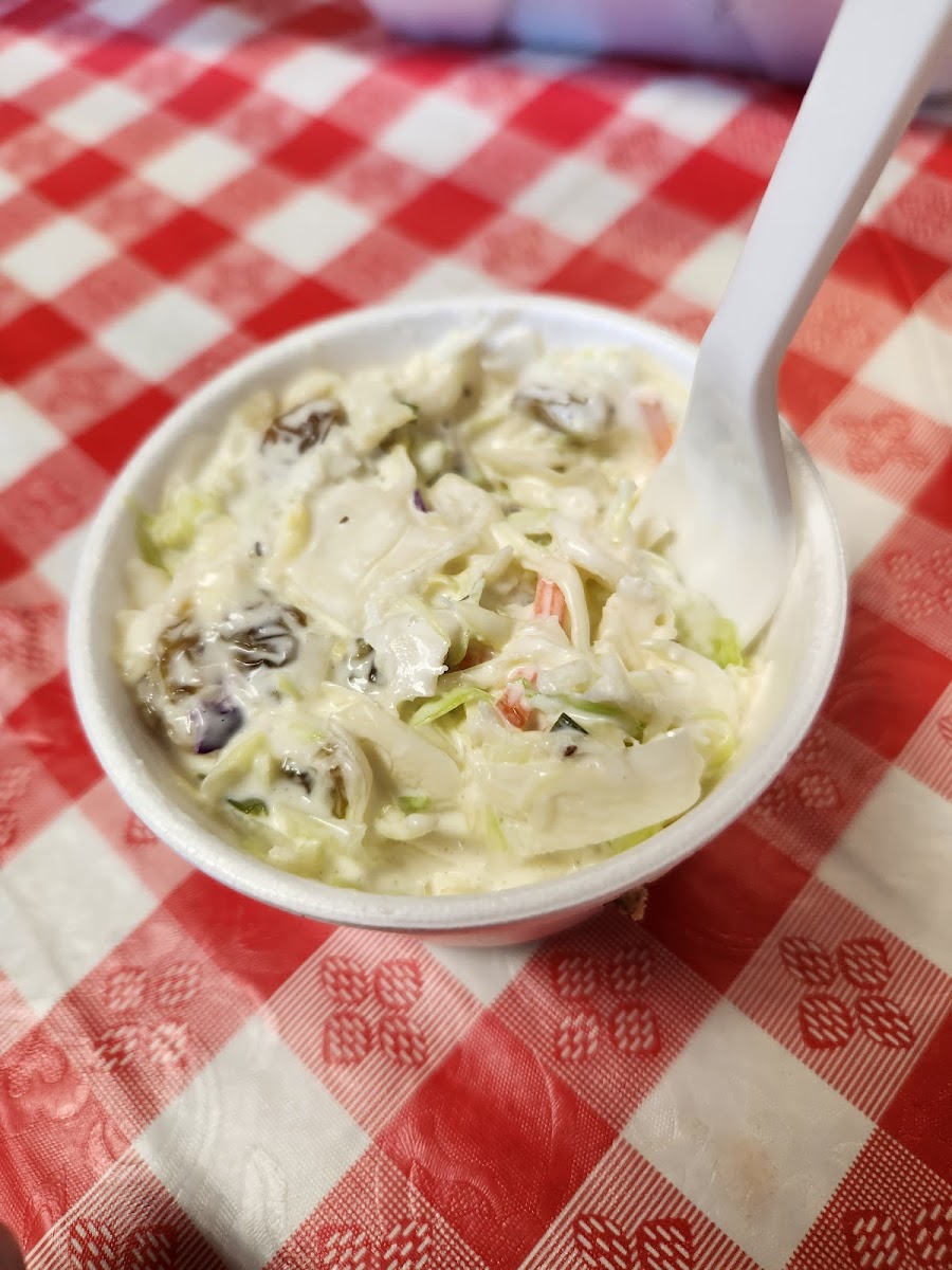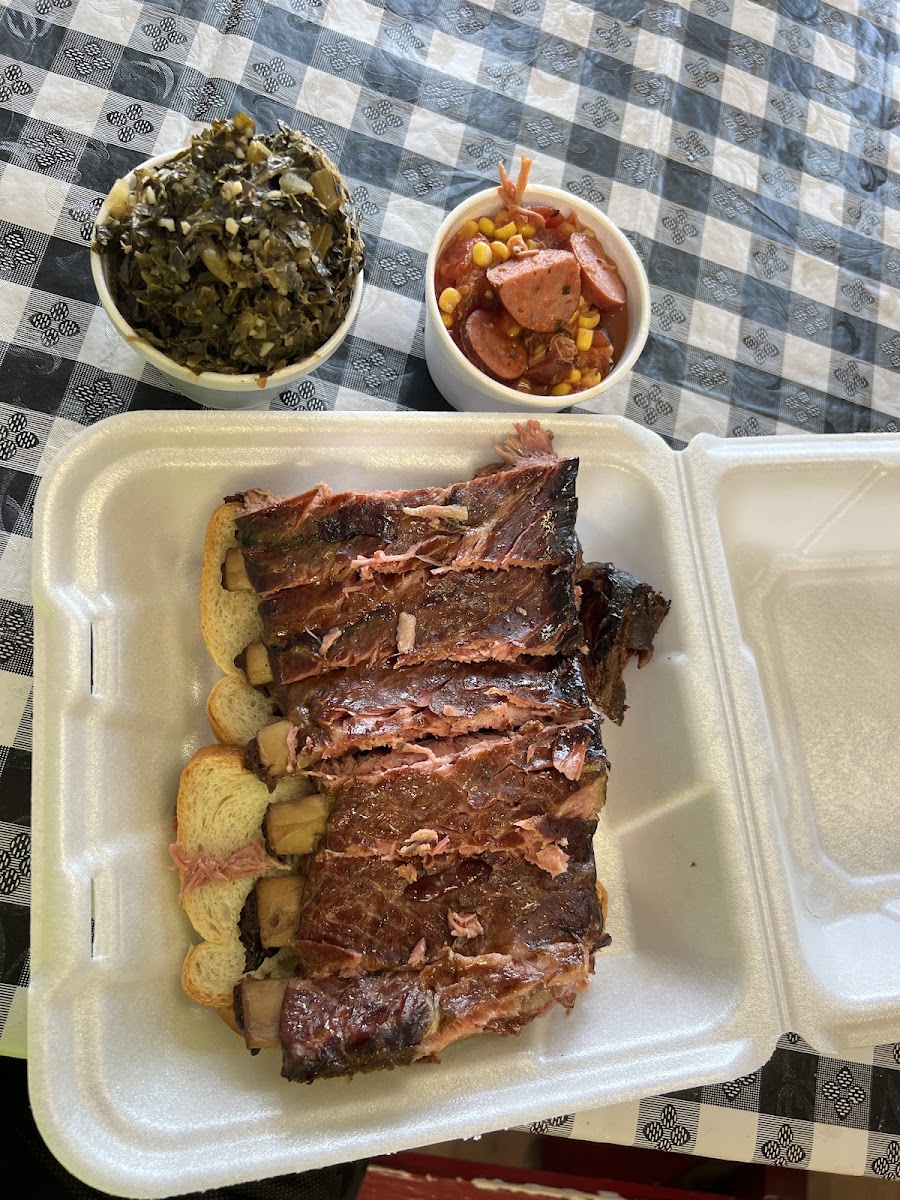 The best ribs I've ever had (and I've had a TON!) We got it with the spicy BBQ sauce. The coleslaw had raisins in it rich made it sweet and very creamy. The collard greens had pulled pork and garlic and tasted AMAZING. We wish we lived closer. Don't miss out on this place!